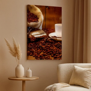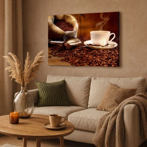El lienzo "Una taza de café sobre un fondo de granos de café y un saco de cereales" muestra una taza de café caliente rodeada de granos de café y un saco de cereales rústico. El fondo de madera y los tonos marrones crean un ambiente acogedor, perfecto para los amantes del café y la relajación.