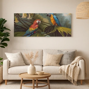- Este colorido lienzo de 70 x 50 cm representa loros en un bosque tropical con un fondo de flores exóticas. Un complemento perfecto para cualquier interior, aportando una atmósfera tropical y una armonía única.