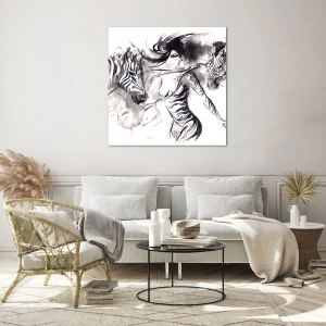Cuadro sobre vidrio - Impresiones sobre Vidrio - Composición en blanco y negro con una mujer y una cebra en estilo artístico. - 70x50cm - Bailando con las cebras - Decoración de pared moderna para salón y dormitorio ARTTOR