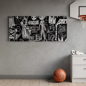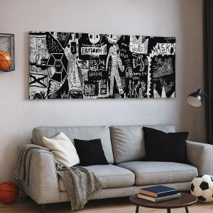 El lienzo "Collage de arte callejero en blanco y negro" es una obra única que llama la atención por su energía y expresividad. La composición, inspirada en el arte callejero urbano, combina diversos motivos gráficos, inscripciones e ilustraciones, creando un collage dinámico y creativo. Los colores, basados exclusivamente en el blanco y negro, le confieren un carácter minimalista y a la vez audaz.