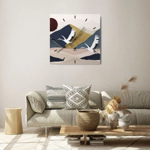 Reloj de pared - Reloj de vidrio - Grúas en vuelo con el telón de fondo de montañas abstractas y el sol. - 30x30cm - Y el día ha vuelto a pasar volando - Decoración de pared moderna para salón, cocina y dormitorio ARTTOR