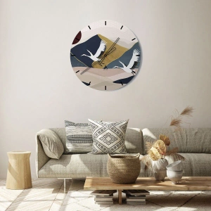 - Este artístico reloj de pared de 30 x 30 cm presenta un motivo de grullas volando sobre montañas abstractas y un sol rojo. Fabricado en vidrio, es redondo y perfecto para interiores orientales, minimalistas y modernos.