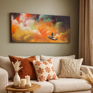 Cuadro mural - En barco por la galaxia - Figura en un barco sobre un fondo de nubes de colores