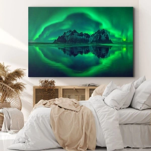 Cuadro mural - Auroras boreales sobre las montañas - Montañas rodeadas por la aurora boreal reflejada en el agua