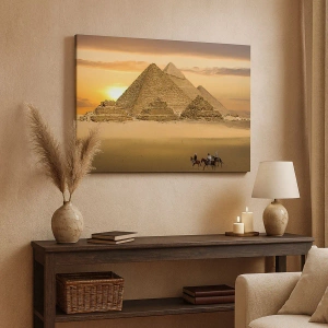 - Esta pintura representa las pirámides egipcias al atardecer, con jinetes a caballo. Perfecta para interiores inspirados en la historia y lo exótico.