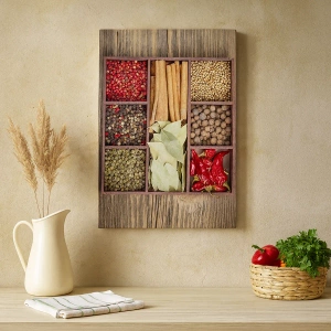 Esta pintura será perfecta como decoración en una cocina, comedor o espacio culinario. Aporta un toque de naturaleza e inspiración a tu interior, fomentando la experimentación en la cocina y la celebración de sabores y aromas. El motivo de especias en la caja de madera también simboliza la tradición y la organización, parte integral de toda cocina. Es una decoración que no solo adorna, sino que también inspira la creación de platos únicos y el descubrimiento de nuevos sabores. Elige este estampado para aportar calidez y armonía a tu interior con detalles de cocina. Esta obra combina la estética con la belleza práctica de las especias, creando el detalle perfecto para los amantes de la inspiración culinaria.
