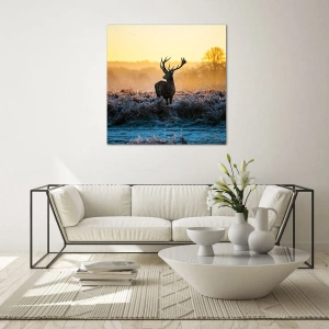 El cuadro sobre vidrio "Ciervo en una mañana helada con el amanecer de fondo" es una decoración única que aporta una atmósfera de paz y la belleza de la naturaleza al interior. El motivo representa un majestuoso ciervo de pie sobre un paisaje helado, bañado por los cálidos rayos del sol naciente. La delicada niebla que lo rodea y los colores invernales confieren a la composición un carácter armonioso y misterioso.