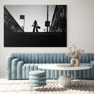 Cuadro sobre vidrio - Impresiones sobre Vidrio - Silueta en blanco y negro de una mujer con el paisaje urbano como telón de fondo - 70x50cm - Paseo urbano - Decoración de pared moderna para salón y dormitorio ARTTOR