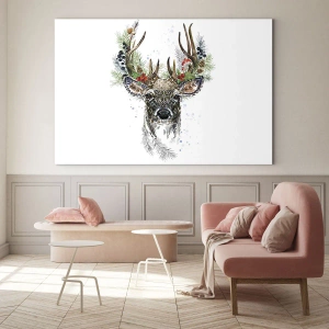 Cuadro sobre vidrio - Impresiones sobre Vidrio - Retrato de un ciervo con adornos navideños, ramas y bayas. - 70x50cm - Con vestimenta festiva - Decoración de pared moderna para salón y dormitorio ARTTOR