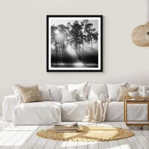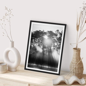 - Este póster representa una escena forestal en blanco y negro con rayos de sol brillando a través de la niebla. Una decoración evocadora que aporta elegancia y tranquilidad a cualquier interior.