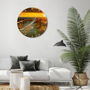 El reloj de pared "Bañado en oro viejo" es un elemento decorativo único que aporta un ambiente tranquilo y romántico al interior. La imagen muestra un sendero de madera que conduce a la playa, bañado por los cálidos colores del atardecer. Los rayos del sol crean un aura mágica que atrae la mirada y tiene un efecto relajante.