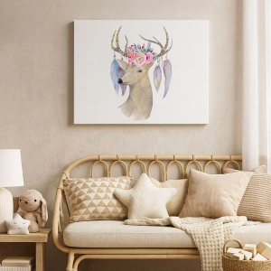 Cuadro sobre lienzo - Impresión de Imagen - Gráfico romántico de ciervo con flores y plumas. - 50x70cm - Guía del alma - gentil, inocente - Decoración de pared moderna para salón y dormitorio ARTTOR