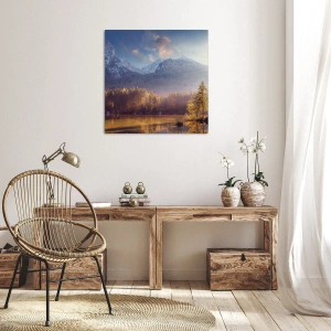 El lienzo "En las montañas y valles" es una decoración de pared única que captura la belleza de la naturaleza en su máxima expresión. La escena representa un paisaje montañoso con un majestuoso bosque y un tranquilo lago, cuya superficie refleja la luz dorada del sol naciente. Las montañas al fondo añaden profundidad al paisaje y realzan su carácter pintoresco.