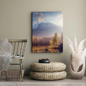 Cuadro de pared - En las montañas y valles - Una pintoresca vista de un bosque de montaña y un lago al amanecer