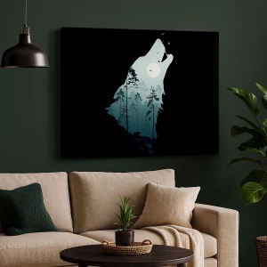 - Esta pintura artística representa a un lobo en un entorno nocturno, recortado por un bosque y la luna. Su elegante diseño combina un fondo negro con sutiles tonos azules, perfecto para interiores modernos.