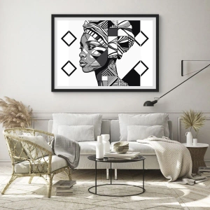 Póster en marco negro - Retrato en blanco y negro de una mujer en estilo étnico. - 70x50cm - Retrato étnico - Decoración de pared moderna para salón y dormitorio ARTTOR