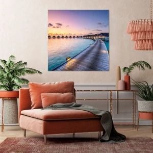 Impresión en lienzo "Vacaciones - Regreso a las Fuentes" es un elemento decorativo único que te transporta a una atmósfera tropical llena de paz y lujo. Representa un pintoresco muelle que conduce a las casas de agua, bañado por la cálida luz del atardecer.