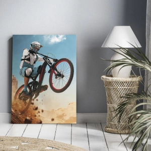 Arte en lienzo "Locura del demonio ciclista" es una composición dinámica que captura un momento de acción y motivación. Representa a un ciclista en bicicleta de montaña realizando un salto espectacular, con un fondo de pintorescas rocas y un cielo azul, creando una imagen llena de energía y movimiento.