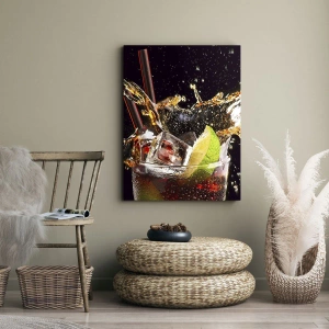 "Alegría y la energía de los colores" es un lienzo enérgico y dinámico que atrae la mirada con la representación realista de una bebida salpicando. El elemento central de la composición es un vaso lleno de una bebida con hielo y rodajas de lima, del que el líquido se vierte con un espectacular chapoteo. El fondo negro intenso acentúa aún más el contraste y la intensidad de los colores, dándole al cuadro un carácter moderno y elegante.