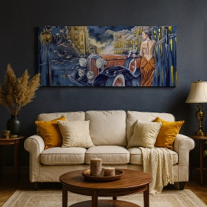 Cuadro sobre lienzo - Impresión de Imagen - Una mujer con un vestido elegante junto a un coche retro por la noche. - 50x70cm - Noche de romanticismo - Decoración de pared moderna para salón y dormitorio ARTTOR