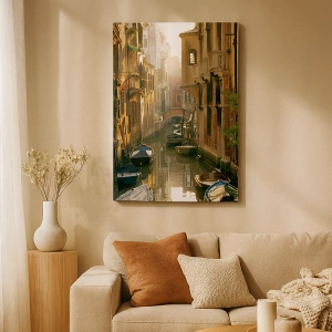 La pintura "Canal de Venecia - Viaje Romántico" presenta una vista increíblemente pintoresca de uno de los canales de Venecia, que deleita con su armonía y su encantadora atmósfera. Los barcos meciéndose suavemente en el agua, el puente que cruza el canal y la arquitectura histórica circundante crean una composición única.