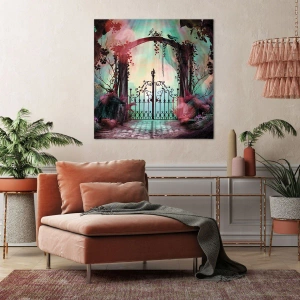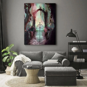 - Este lienzo de 70 x 50 cm representa una entrada mágica con una puerta de hierro forjado rodeada de exuberante y colorida vegetación. Una decoración única que crea una atmósfera misteriosa y fantástica.