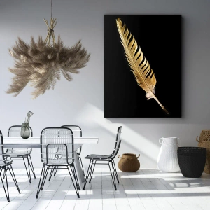 El contraste entre el negro intenso y el dorado brillante realza el carácter lujoso de la pintura. Los detalles de la pluma se han reproducido con precisión, dándole al conjunto un aspecto realista y artístico. La simplicidad de esta composición la hace ideal para interiores modernos con un estilo sofisticado.