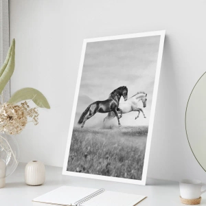 Póster - Dos caballos al galope en una composición dinámica en blanco y negro - 100x70cm - Ángeles y demonios - Decoración de pared moderna para salón y dormitorio ARTTOR