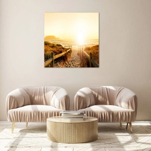 Cuadro sobre vidrio - Impresiones sobre Vidrio - Camino sobre la duna que conduce a la playa al atardecer - 50x70cm - A través de la duna, hacia el sol - Decoración de pared moderna para salón y dormitorio ARTTOR