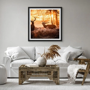 Póster en marco negro - Dos ciervos al atardecer en un paisaje invernal. - 70x50cm - El sueño de un cazador - Decoración de pared moderna para salón y dormitorio ARTTOR