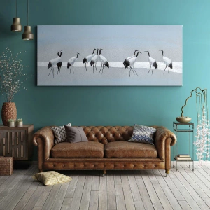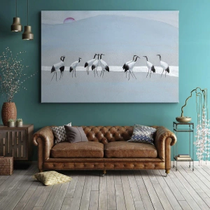 Cuadro sobre lienzo - Impresión de Imagen - Un grupo de grullas contra un cielo azul y el sol naciente. - 50x70cm - Después de un día caluroso - Decoración de pared moderna para salón y dormitorio ARTTOR