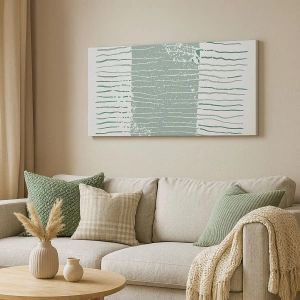 - Este lienzo presenta un patrón geométrico en tonos verde mar y blanco. Es la opción perfecta para interiores que valoran el minimalismo y la armonía.