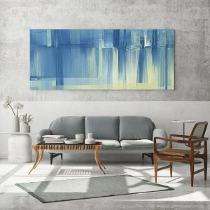 Cuadro sobre vidrio - Impresiones sobre Vidrio - Pinceladas abstractas en turquesa y amarillo - 50x70cm - Composición en turquesa - Decoración de pared moderna para salón y dormitorio ARTTOR