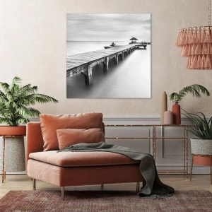 Cuadro sobre lienzo - Impresión de Imagen - Una vista en blanco y negro de un muelle de madera sobre aguas tranquilas. - 120x50cm - Lejos - Decoración de pared moderna para salón y dormitorio ARTTOR