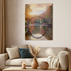 Gracias a los expresivos colores otoñales y a la detallada reproducción de los reflejos en el agua, la pintura atrae la atención y aporta profundidad y un carácter único al interior. El puente de piedra, que forma un círculo casi perfecto con su reflejo, simboliza la armonía y el equilibrio, convirtiendo esta pintura en una pieza inspiradora para cualquier estancia.
