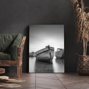 • La pintura representa barcos abandonados que descansan sobre una superficie de agua tranquila en una estética en blanco y negro. Un paisaje sutil lleno de nostalgia y reflexión, perfecto para interiores minimalistas o clásicos.