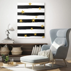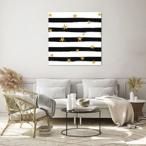 Cuadro sobre vidrio - Impresiones sobre Vidrio - Rayas blancas y negras con estrellas doradas - 70x50cm - Todos hemos nacido bajo una estrella de la suerte - Decoración de pared moderna para salón y dormitorio ARTTOR