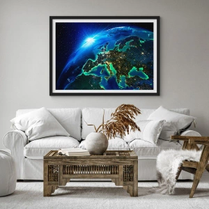 Póster en marco negro - Una vista de Europa desde el espacio bajo el resplandor del sol naciente. - 70x50cm - Una Europa resplandeciente - Decoración de pared moderna para salón y dormitorio ARTTOR