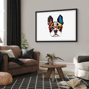 - Este colorido póster representa el retrato de un perro con gafas en estilo pop art. Su marco negro es una decoración de pared moderna perfecta, aportando un toque único y expresivo a cualquier interior.
