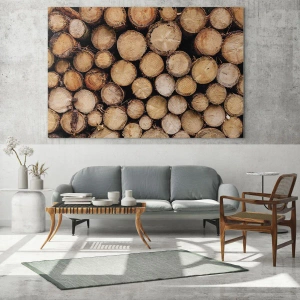 - La fotografía muestra troncos de árboles compactos con anillos de crecimiento claramente visibles, capturando la belleza natural de la madera y la atmósfera del bosque. La imagen aporta calidez, armonía y un carácter rústico al interior.