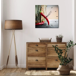 Reloj de pared - Reloj de vidrio - Dos chiles rojos sobre un fondo de madera con acento rústico. - 30x30cm - Pimientos rojos picantes - Decoración de pared moderna para salón y dormitorio ARTTOR