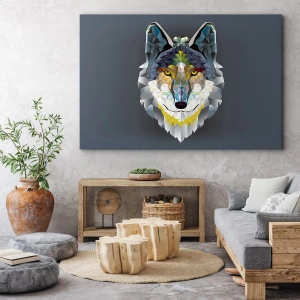 - Un cuadro sobre lienzo que representa una imagen geométrica de un lobo sobre un fondo gris, que aporta modernidad y elegancia al interior.