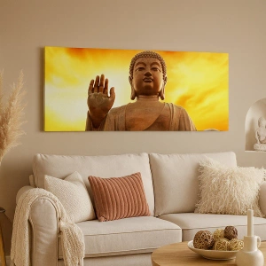 Cuadro sobre lienzo - Impresión de Imagen - Una estatua de Buda contra un cielo dorado al atardecer. - 50x70cm - La calma del mundo - Decoración de pared moderna para salón y dormitorio ARTTOR