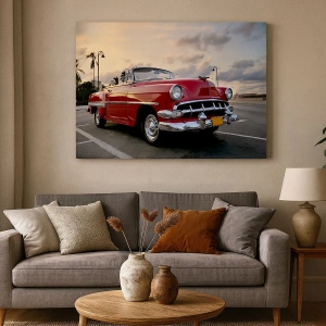 Cuadro sobre lienzo - Impresión de Imagen - Un clásico convertible rojo aparcado junto a las palmeras al anochecer. - 50x70cm - El rojo calor de los trópicos - Decoración de pared moderna para salón y dormitorio ARTTOR