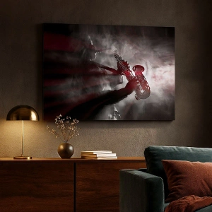 Cuadro sobre lienzo - Impresión de Imagen - Saxofonista en humo en el escenario en negro y rojo atmosférico - 50x70cm - En el vapor del jazz - Decoración de pared moderna para salón y dormitorio ARTTOR