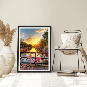 Póster en marco negro - Bicicletas en un puente bajo el resplandor del sol poniente. - 70x50cm - Mañana de primavera en Ámsterdam - Decoración de pared moderna para salón y dormitorio ARTTOR