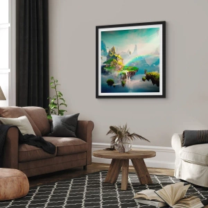 Póster en marco negro - Islas voladoras entre las nubes con un arcoíris en el horizonte. - 70x50cm - El medio de la nada - islas flotantes - Decoración de pared moderna para salón y dormitorio ARTTOR