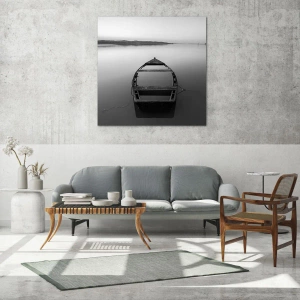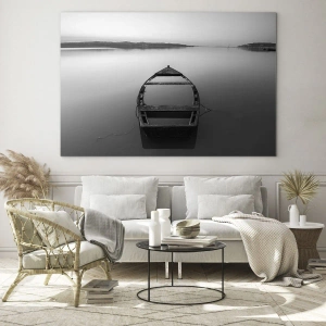 Cuadro sobre vidrio - Impresiones sobre Vidrio - Un viejo barco en una superficie de agua tranquila en blanco y negro. - 50x70cm - Anhelo y melancolía - Decoración de pared moderna para salón y dormitorio ARTTOR