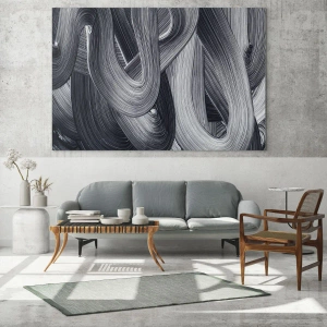 La pintura irradia energía rítmica, emanada de líneas suaves pero decididas que guían la mirada por toda la superficie. El motivo monocromático se inscribe en el canon del minimalismo y el arte contemporáneo, donde la forma, la textura y el espacio se convierten en la esencia. Esta obra es perfecta para interiores que requieren un toque artístico distintivo pero discreto.