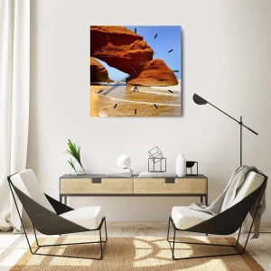 "Agua y viento milenarios" es un reloj de pared único de 30 x 30 cm, fabricado en vidrio, cuyo motivo es una pintoresca playa con sus características rocas rojas arqueadas. La composición con el cielo azul, la arena dorada y las suaves olas del océano crea una atmósfera de relajación y un clima exótico. Es un paisaje único que transporta al observador a un mundo de belleza natural y armonía.